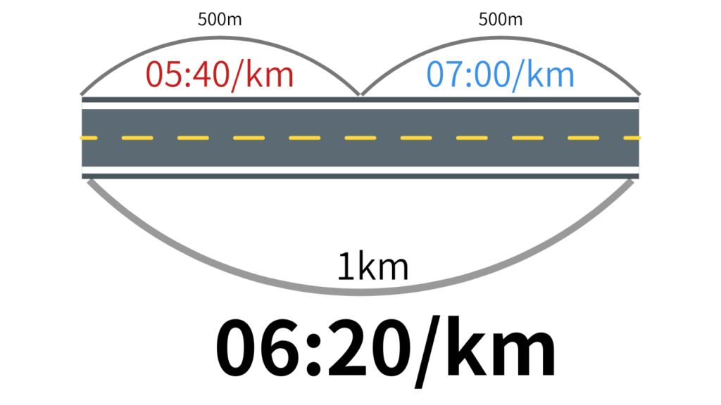 - 後半500mは07:00/kmで走る場合は1kmに06:20かかります。